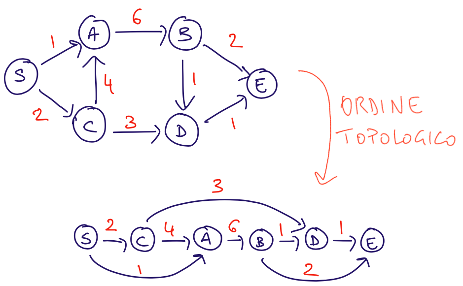 Input: DAG G=(V, E), nodo sorgente s, funzione sugli archi Output: distanze minime dei nodi di G da s