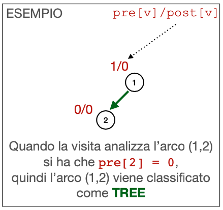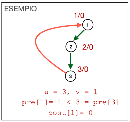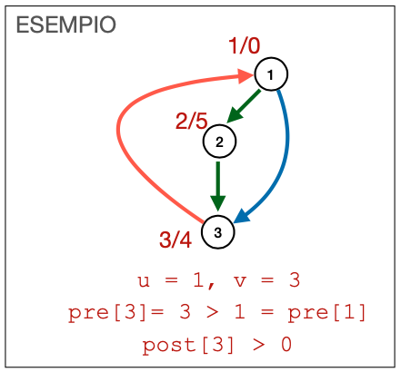Back edge Arco che porta ad un nodo già visitato, e non appartiene quindi all’albero di copertura. Rivela cicli. La visita dell’antenato v (1 nell’immagine), termina successivamente alla visita del nodo u (3 nell’immagine).