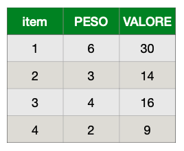 Input: zaino di capacità , oggetti , pesi , valore Output: selezionare degli oggetti con somma dei pesi totale minore o uguale a e che massimizzi il valore totale degli oggetti selezionati.