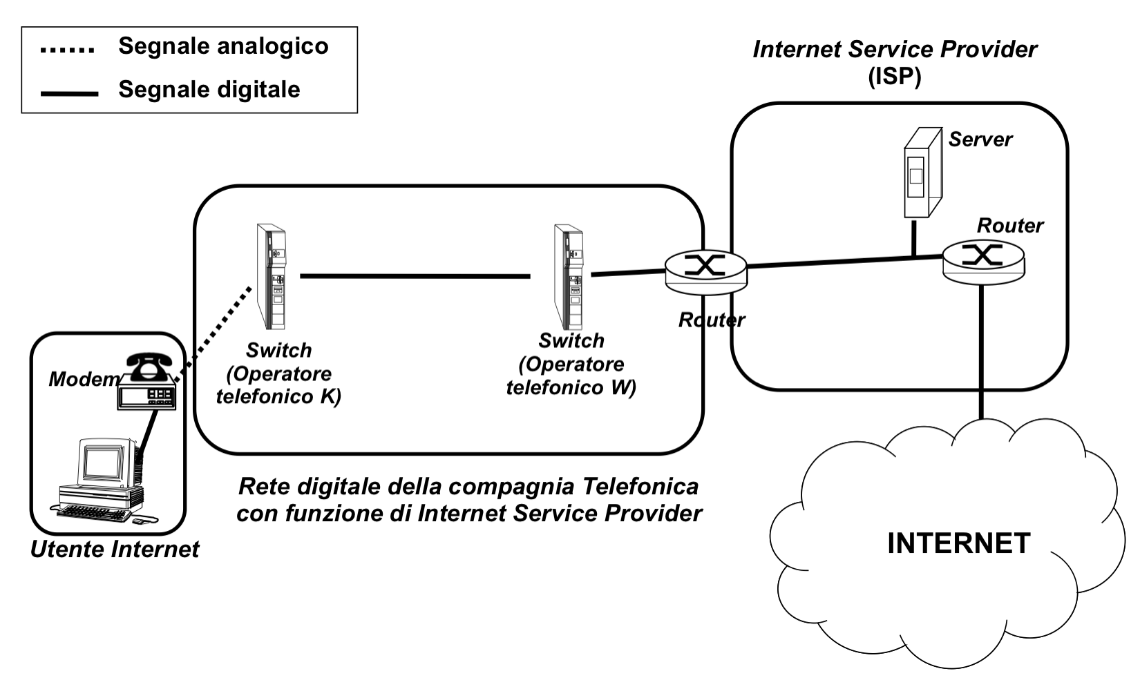 Linea analogica commutata ⇒ linea digitale commutata Non c’è quindi bisogno di modem, dal momento che la linea ISDN è già digitale. La banda massima è di 128kbps in due canali da 64kbps.
