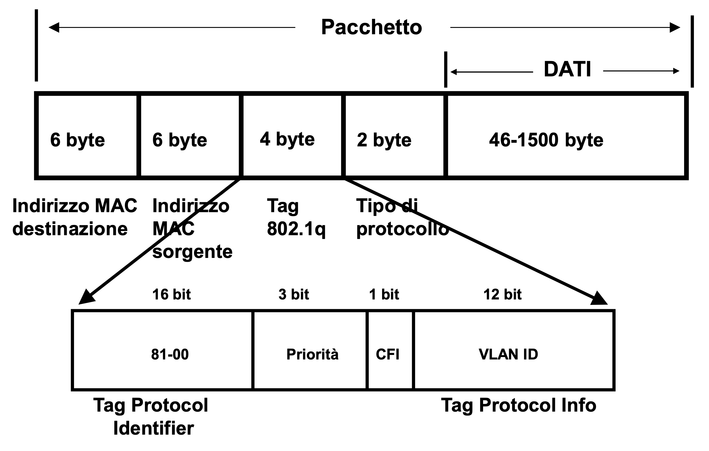 Quando ogni frame passa attraverso uno switch, gli viene inserito un tag nell’header (per protocollo 802.1q - o viene incapsulato per Inter-Switch Protocol) per identificare la VLAN a cui quella richiesta appartiene. Quando lo switch di arrivo riceve il frame, viene letto e poi eliminato il tag VLAN, e quel frame verrà gestito in quel dominio di broadcast e passato all’host di destinazione.