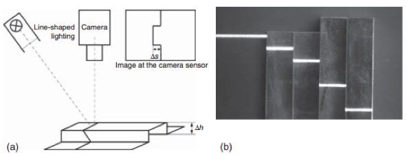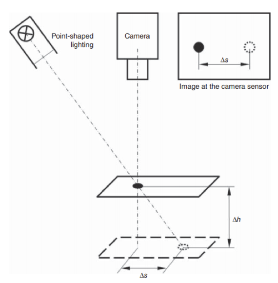 Proietta una linea con un certo angolo e tiene il sistema di visione perpendicolare rispetto alla superficie del campione. Usata per misurare la differenza di altezza tra una superficie e l’altra sfruttando il principio di triangolazione