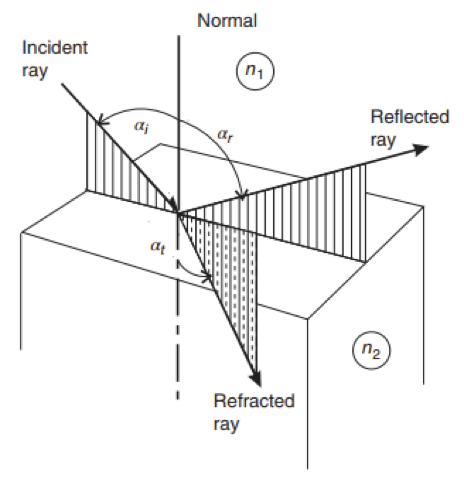 Quando un raggio passa da un mezzo ad un altro, una parte viene riflessa con un angolo uguale ed opposto a quello di incidenza. L’altra parte viene diffusa nel mezzo con un angolo (definito dalla Legge di Snell) che dipende dalle proprietà dei due mezzi.
