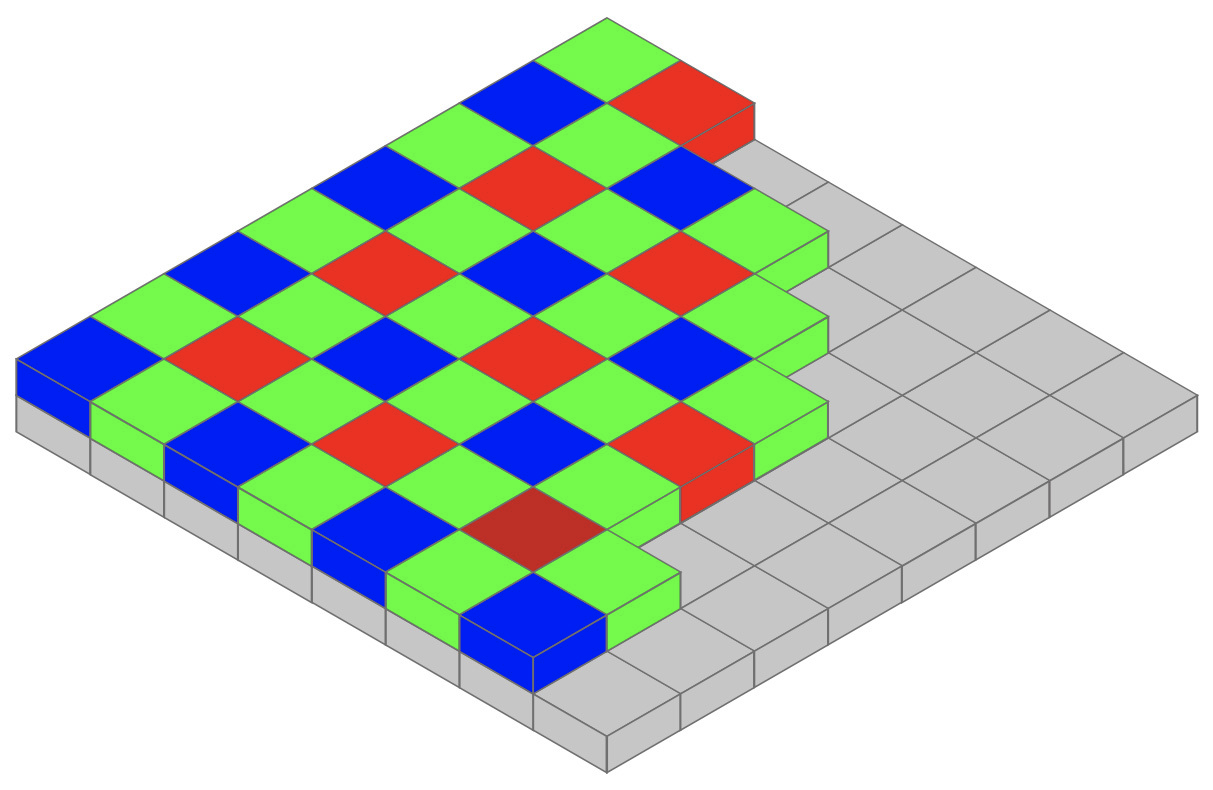 Il sensore ha matrice bidimensionale. Come è possibile avere una matrice tridimensionale in uscita? Davanti al sensore si mette un array di filtri, il più comune è il filtro di Bayer. È formato da un pattern con un filtro blu, due filtri verdi e uno rosso, che si ripete davanti al sensore. Il 50% dei pixel sarà filtrato sul verde, il 25% sul rosso e il 25% sul blu. Ogni pixel riceve le informazioni solo sulla lunghezza d’onda del filtro che ha davanti. Il resto della luce viene scartato.