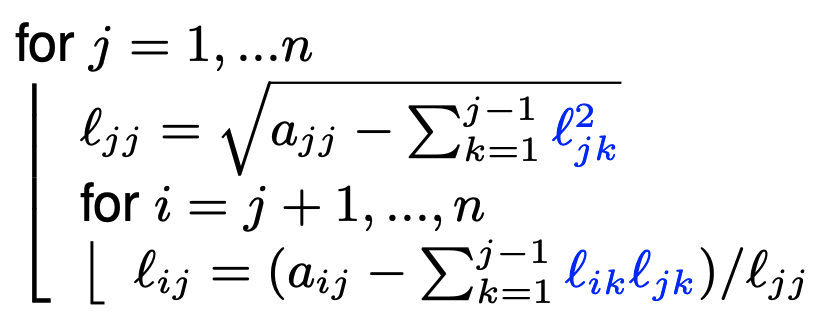 Seguendo le regole di pavimentazione della Fattorizzazione matrici simmetriche , si ottiene l’algoritmo di Cholesky sostituendo le relazioni precedenti con